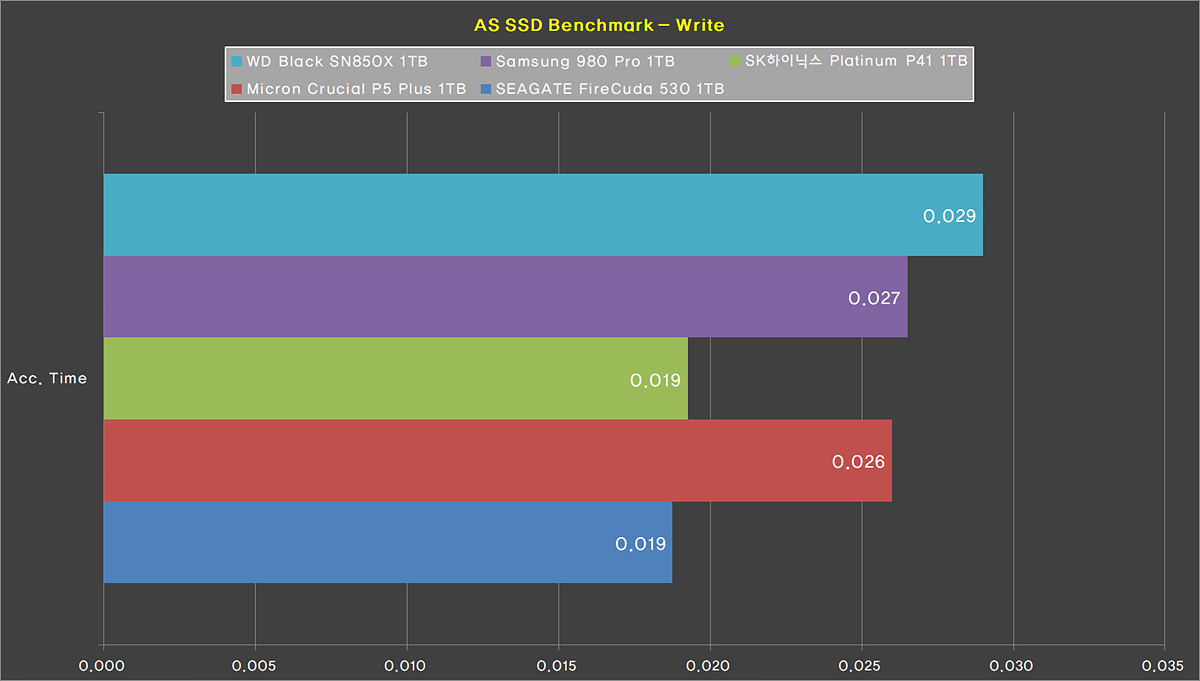 다른 제품들과 Access Time 측정값에서 큰 차이를 보여서 여러 번 테스트를 해봤지만 결과는 마찬가지였습니다. 앞서 언급했지만 WD 제품들은 쓰기(Write)에서 다소 약한 제품들도 있었지만 읽기(Read)에서는 대체적으로 높은 점수를 나타냈는데 이번 SN850X의 측정 결과는 좀 의외였습니다.