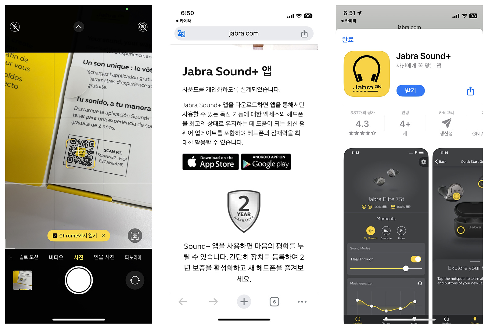 박스 안쪽의 QR코드를 인식하면 이어폰을 더욱 편리하게 활용할 수 있는 Jabra Sound+ 앱을 다운로드할 수 있습니다. (자브라 사운드+ 앱은 IOS, 안드로이드 모두 지원합니다.)