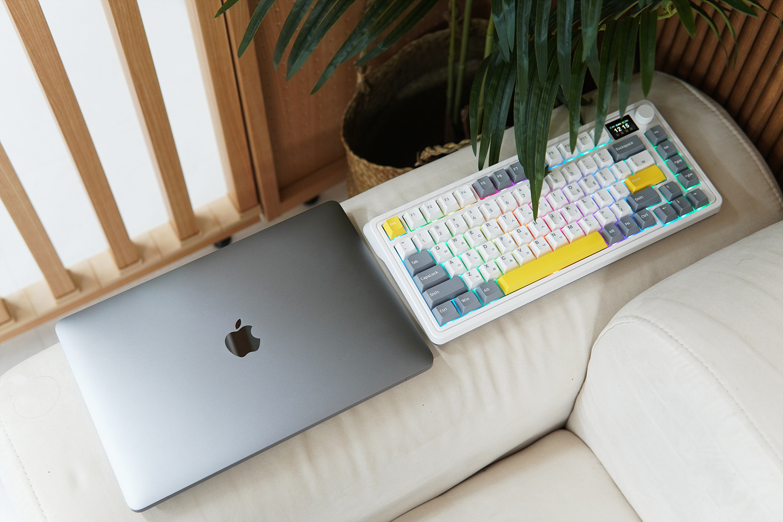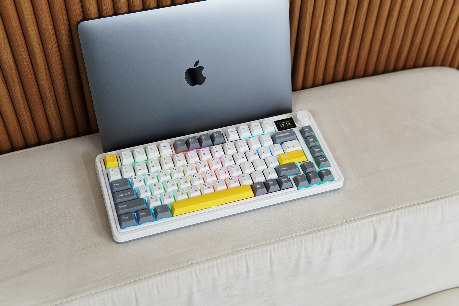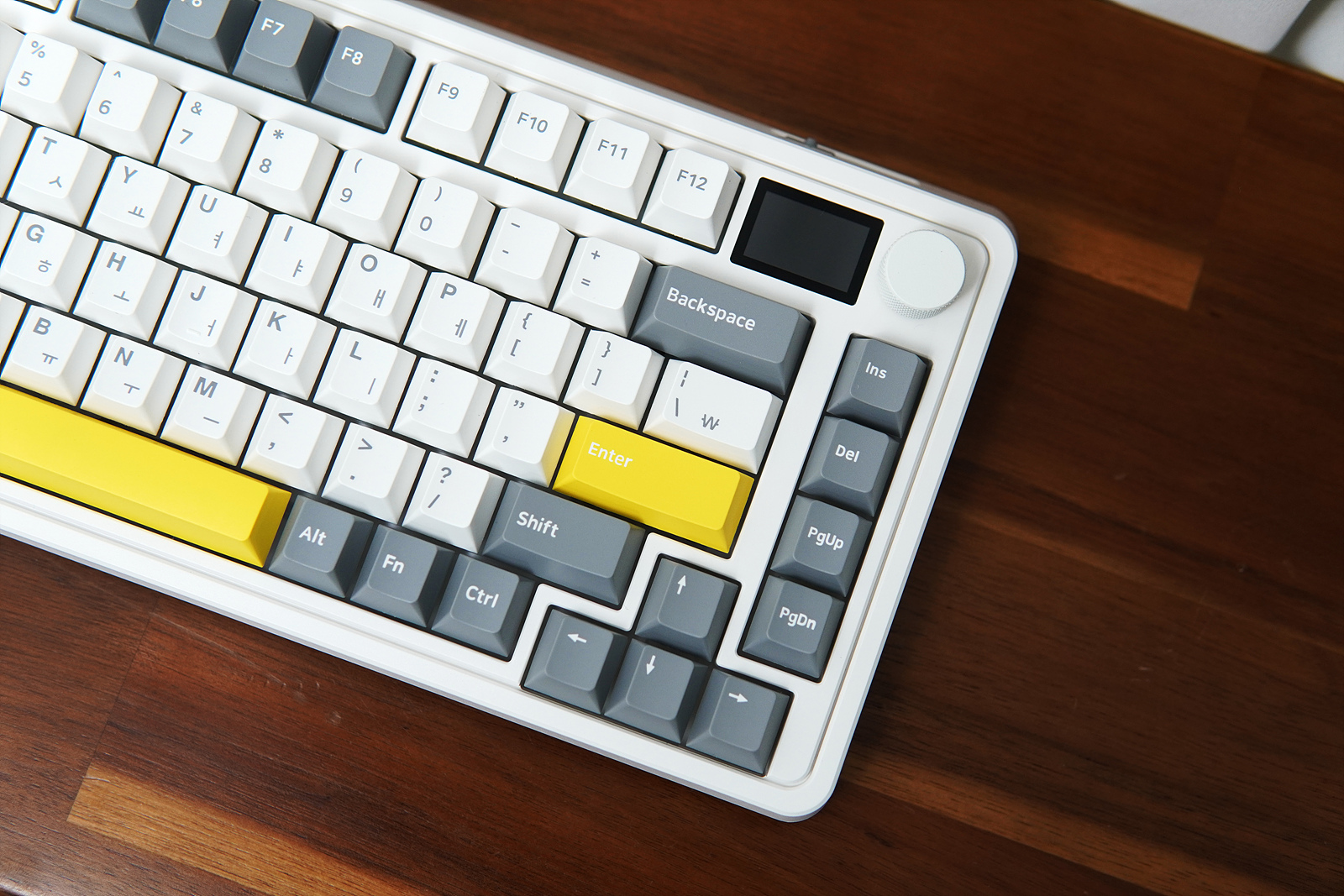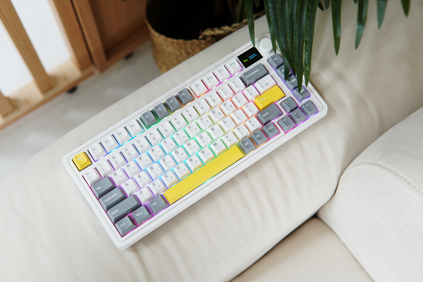 CMK75는 챠콜 그레이 / 발렌타인 핑크 / 화이트 그레이 세 가지 색이 있으며 제가 소개하는 제품은 화이트 그레이입니다. 일반적인 풀 사이즈나 텐키리스보다 더 작은 75% 크기의 81 Key 배열이라 사용자마다 호불호가 나뉠 수 있습니다. 오른쪽에는 1.17인치의 LCD 화면서 조절 노브가 있어서 다른 키보드와는 크게 다른 모습을 하고 있습니다.