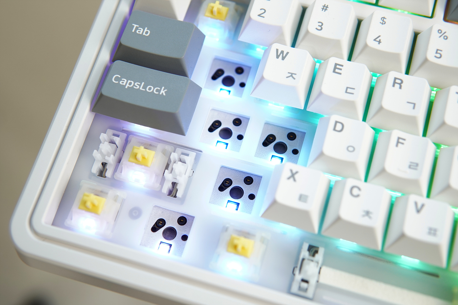 체리 타입의 스테빌라이저는 윤활 처리가 되어있으며 LED는 SMD 타입으로 기판 안쪽에 장착이 되었습니다. 스위치는 3핀 5핀 모두 사용할 수 있으며 정방향으로 되어서 낮은 높이의 키캡도 문제없이 사용할 수 있습니다.