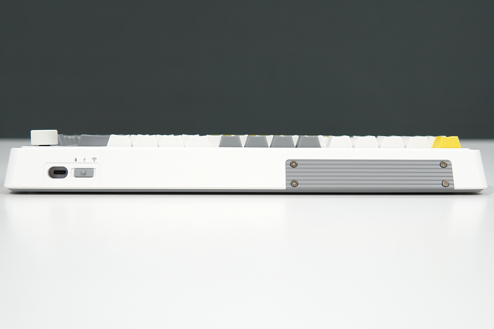 위쪽 측면에는 무선, 유선, 블루투스를 선택할 수 있는 버튼과 케이블을 연결할 수 있는 Type-C 포트가 있습니다. 추가로 두 개의 무게 추(회색 줄무늬)가 있는데 일반적인 십자나사나 육각이 아닌 별나사로 되어있어서 분해하려면 전용 공구가 필요합니다. (바닥에 있는 무게추를 제거하면 배터리를 확인할 수 있습니다.)
