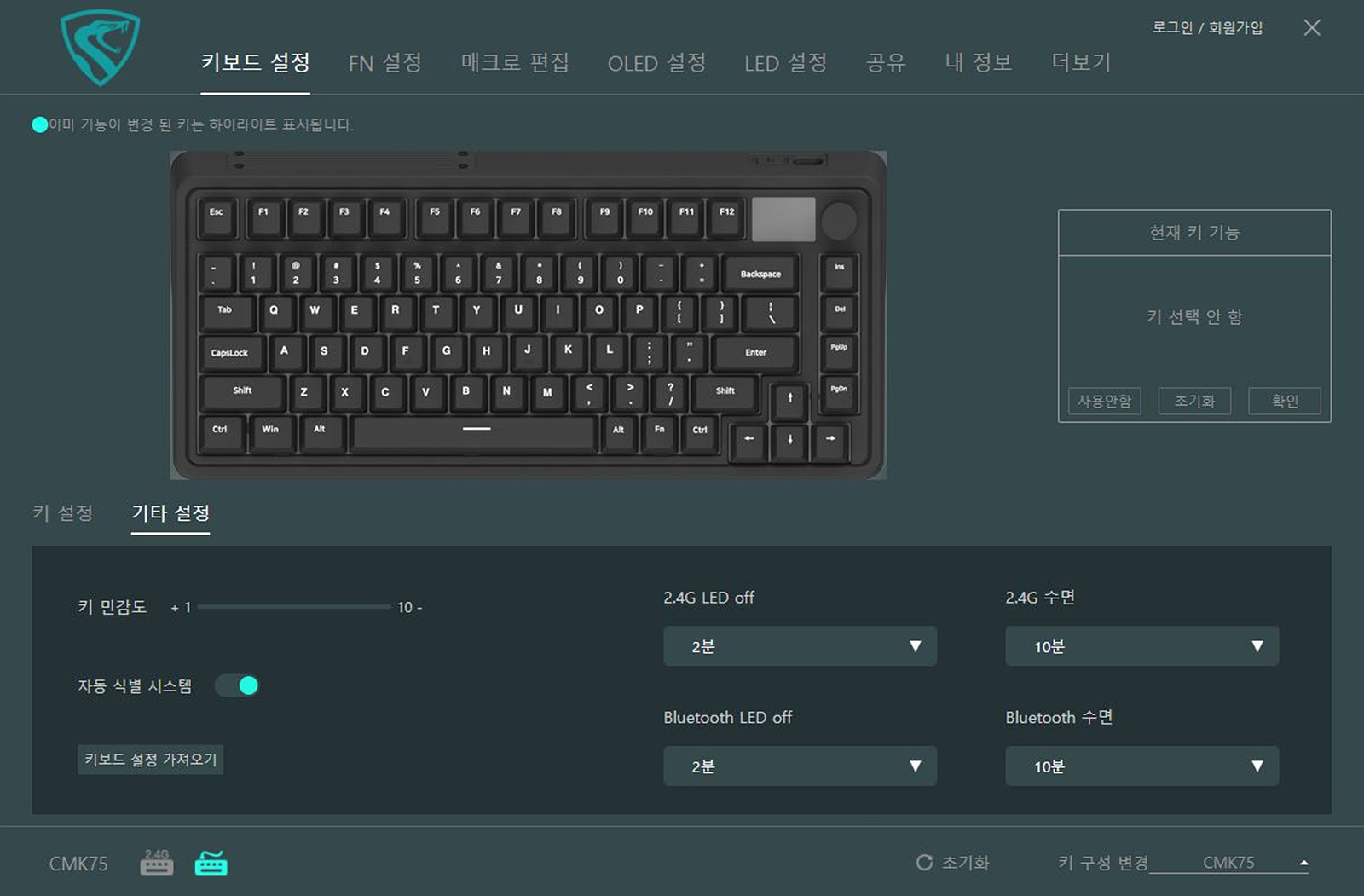 CMK75는 전용 소프트웨어를 사용해서 LCD 화면과 키 매핑, LED 변경등 여러 가지 부가 기능을 편리하게 설정할 수 있으며 변경된 설정은 키보드에 저장이 되어 다른 기기에서도 그대로 사용할 수 있습니다.
