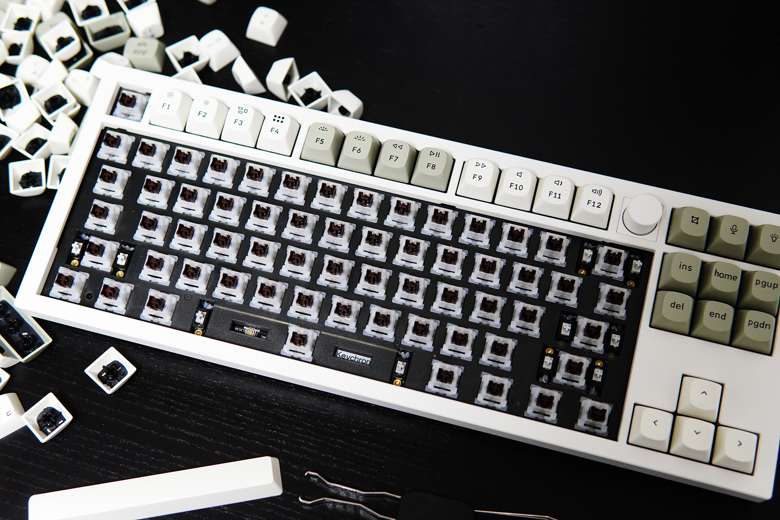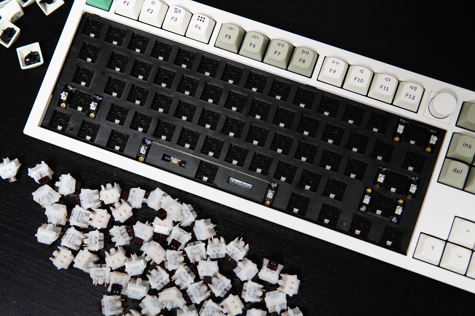 저소음 갈축 스위치를 모두 제거한 뒤 키저화(키크론 저소음 화이트) 스위치로 교체를 했습니다. 키크론 스위치뿐 아니라 3핀 5핀 스위치는 모두 사용할 수 있으며 장착할 때는 스위치의 핀이 휘지 않도록 조심하시기 바랍니다.