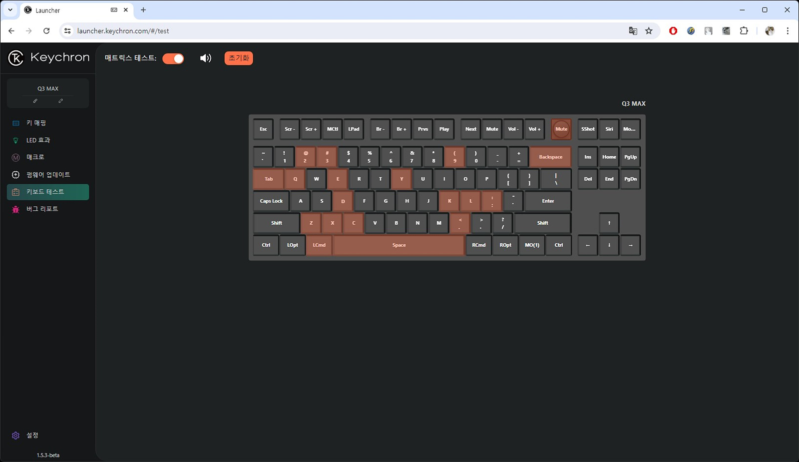 테스트에서는 해당 키의 사용을 화면과 소리로 직접 확인할 수 있습니다. 위쪽의 초기화를 누르면 해당 키를 누르면서 화면에 표시된 색은 모두 사라집니다.