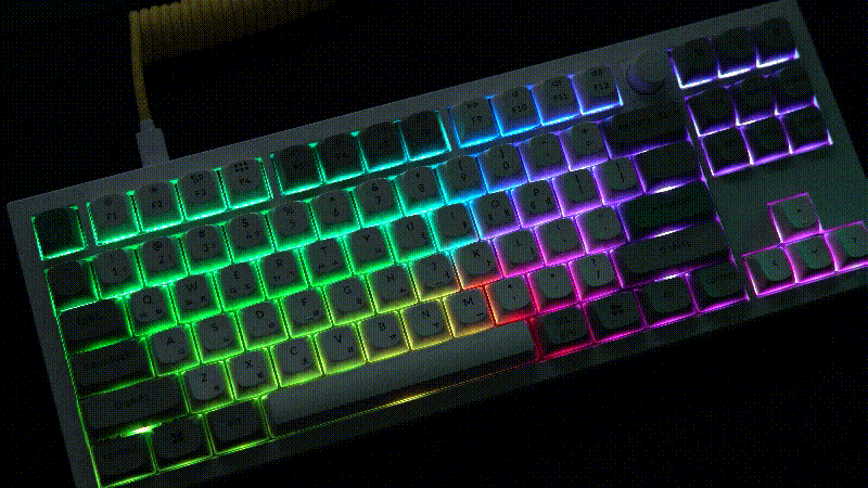 케이블을 연결하거나 무선 모드로 전원을 켜면 RGB LED를 확인할 수 있습니다. 이중 사출 키캡이 아니라 키캡 자체에 LED가 표시되지는 않지만 않지만 어두운 곳에서 사용하기에는 부족하지 않습니다.