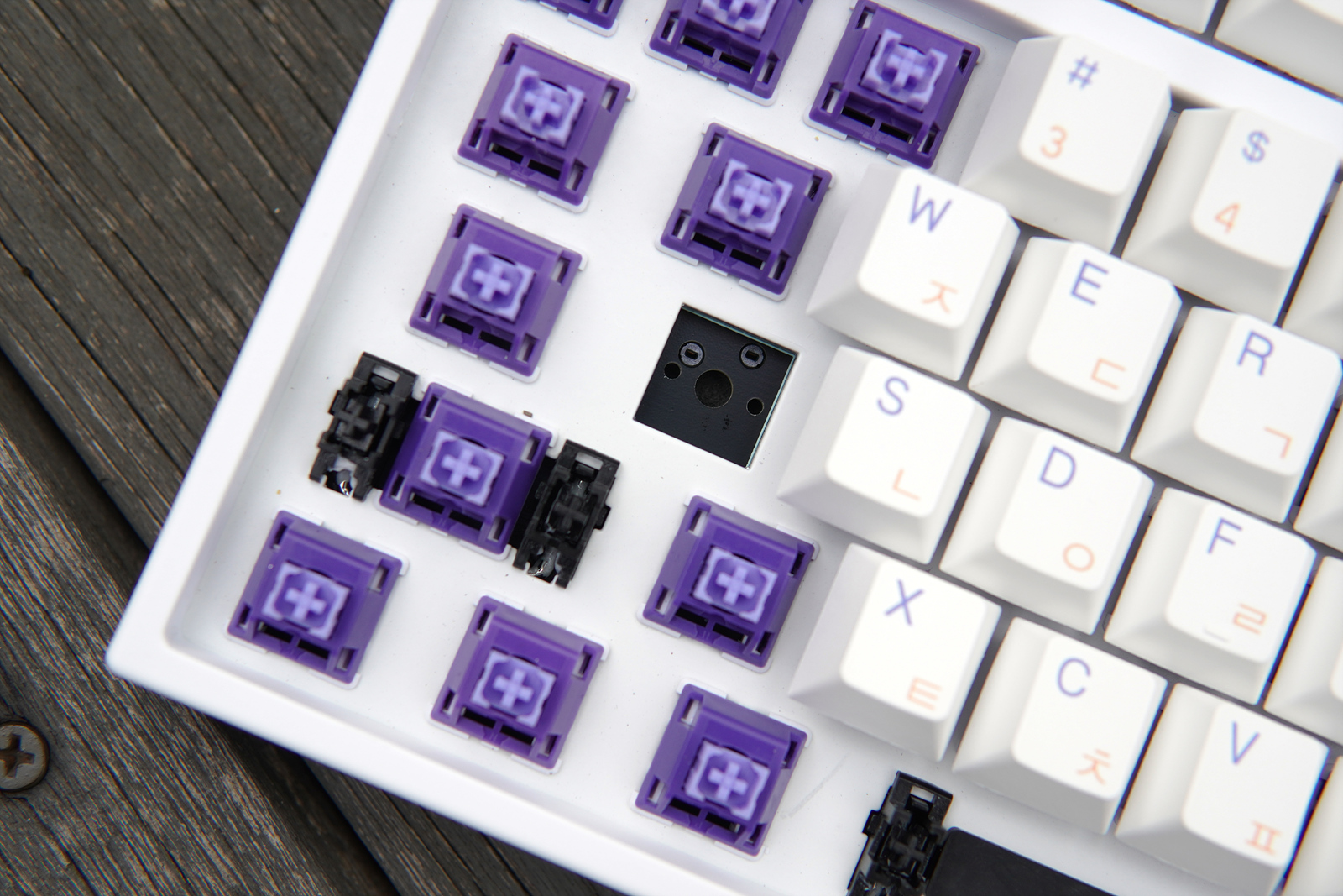 기판(PCB)은 3핀과 5핀 스위치 모두 사용할 수 있는 퀵스왑 소켓이며 정방향으로 설계되었습니다. 스페이스에는 통울림을 줄이기 위한 러버(고무) 가이드 두 개가 사용되었으며 스테빌라이저에는 모두 윤활이 되어있어서 거슬리는 철심 소리를 줄여주고 있습니다.