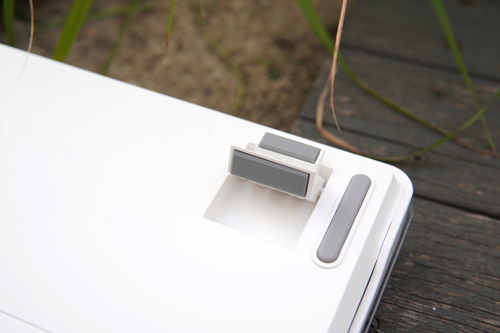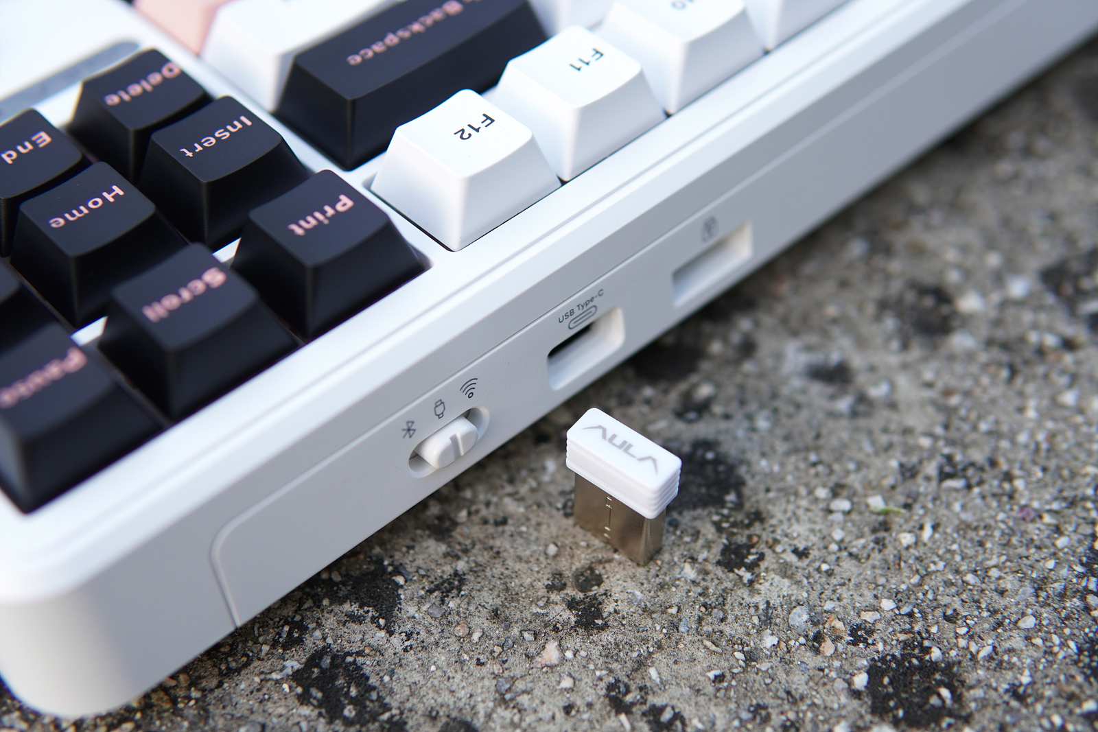 키보드 위쪽 측면에는 블루투스, 유선, 무선(2.4GHz) 모드 스위치, Type-C 포트와 무선 연결용 수신기(동글)를 보관할 수 있는 공간이 있습니다. 유선 모드에서는 키보드의 사용과 자동으로 충전이 이루어지는데 F87 Pro의 배터리 용량은 4,000mAh입니다. 형제라고 할 수 있는 F99는 8,000mAh로 배터리 용량이 더 근데 아무래도 배열의 차이에 따른 하우징 공간이 있다 보니 4,000mAh 배터리 두 개가 병렬로 연결되었을 거라 예상됩니다.