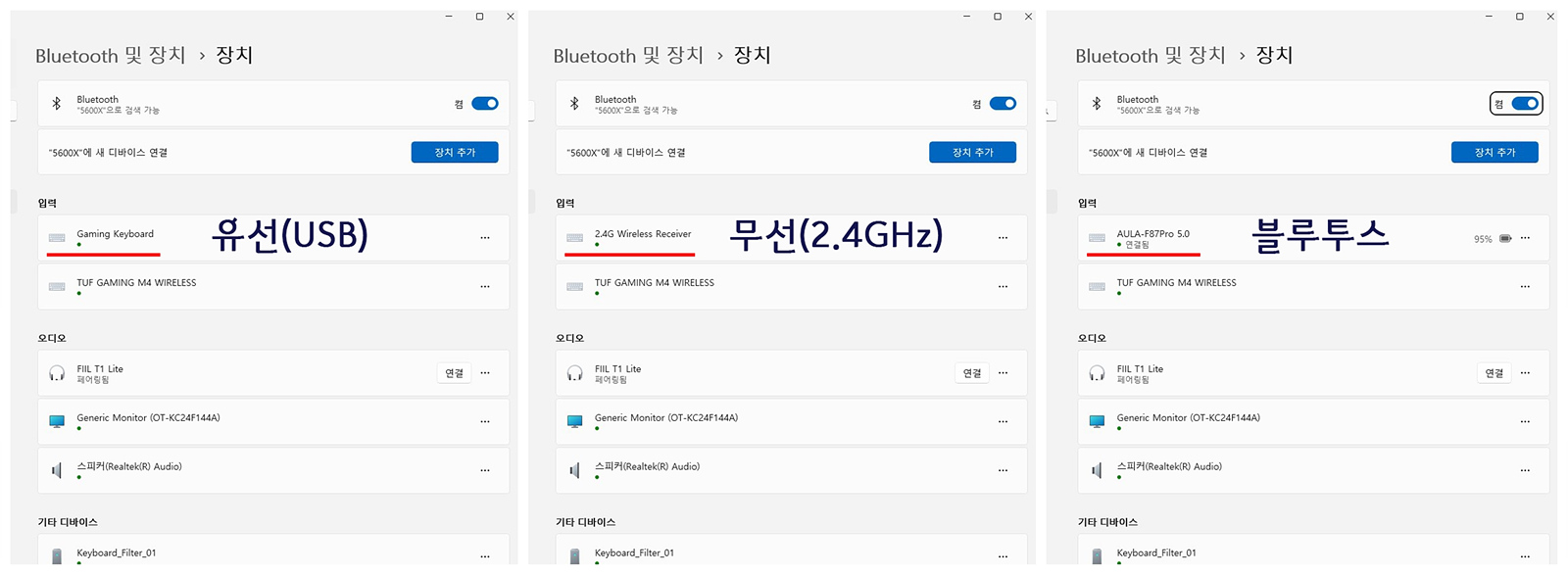 연결 모드에 따라 표시되는 이름이 조금씩 달라지며 블루투스에서는 배터리 잔량을 확인할 수 있습니다.