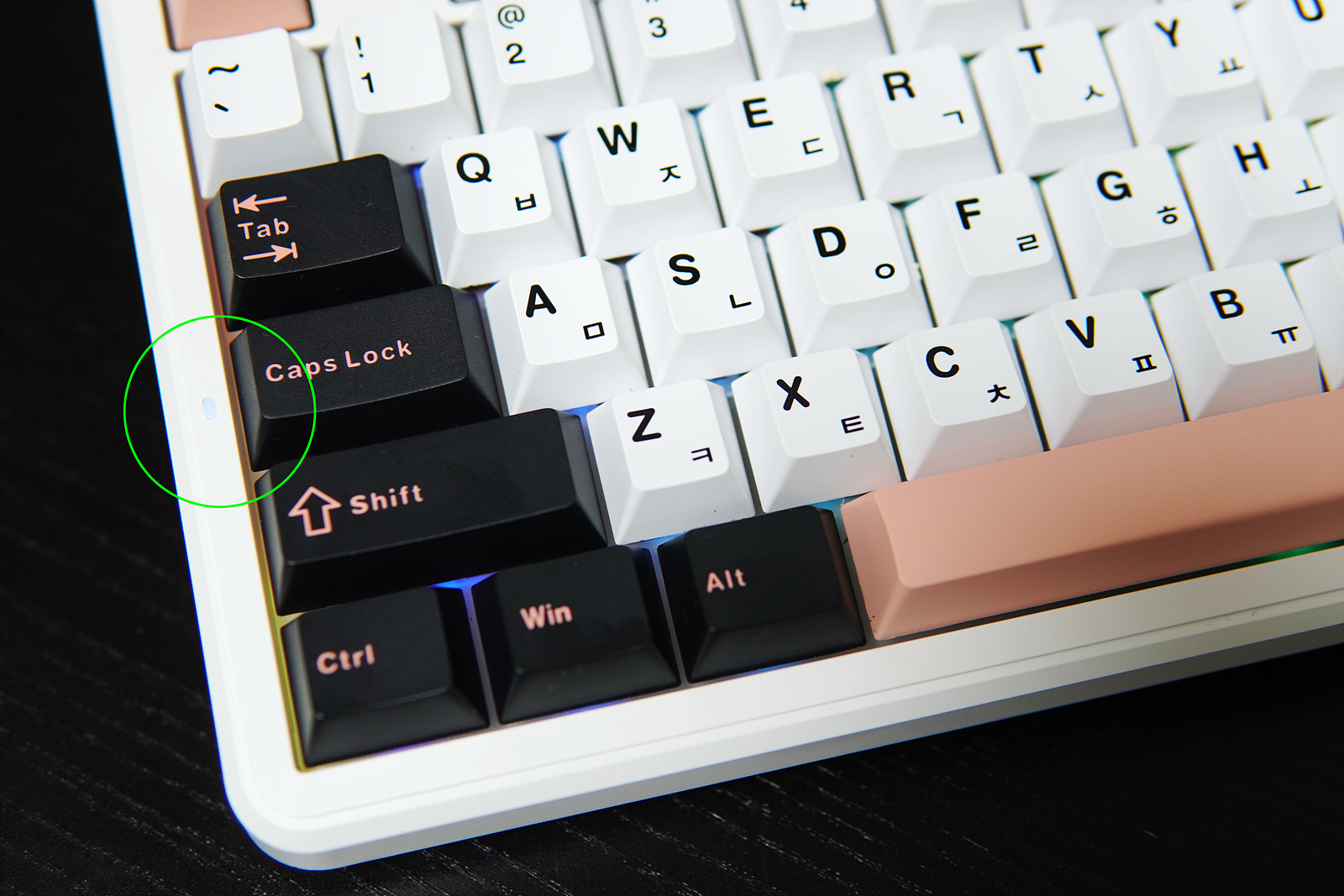 F87 Pro 독거미는 조금 특이하게 Caps Lock 상태 표시 LED가 해당 키 바로 옆쪽에 배치되어 있습니다. 아래에서 다시 언급을 하겠지만 개인적으로 독거미 키보드의 가장 큰 단점이라고 생각합니다. 변태 배열도 아니고 굳이 이렇게 배치를 할 필요가 있나? 싶더군요.