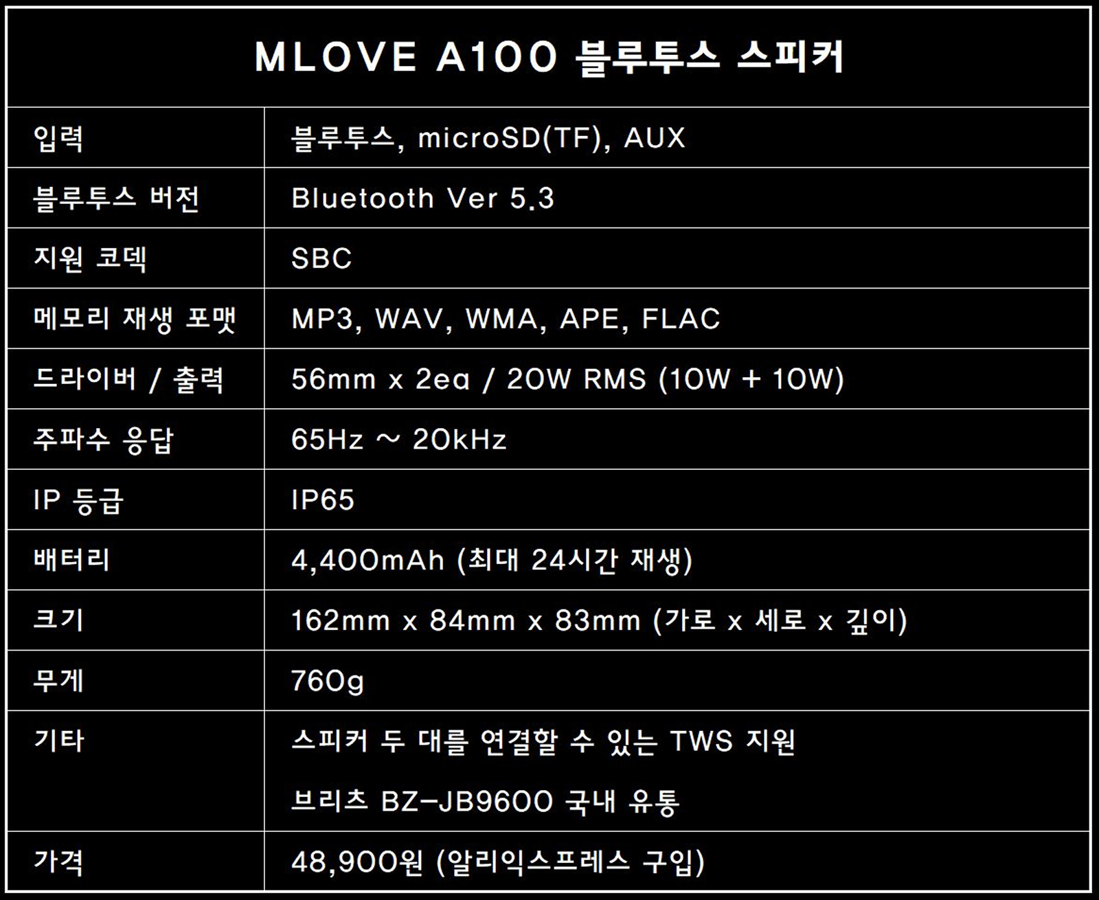 이전에 경험해보지 못했던 장비를 사용하거나 구입할 때도 그렇지만 처음 보는 브랜드의 제품을 사용할 때는 묘한 설렘 같은 게 있습니다. 특히나 기존 사용자들의 평가가 좋은 제품이라면 이런 설렘과 기대는 더욱더 커지게 되는데 MLOVE A100 블루투스 스피커 역시 기존 사용자들의 입소문으로 나름 유명세를 탄 제품입니다. 저는 알리에서 직구를 했지만 국내에서도 BZ-BJ9600이라는 이름으로 브리츠에서 정식으로 유통이 되고 있습니다.