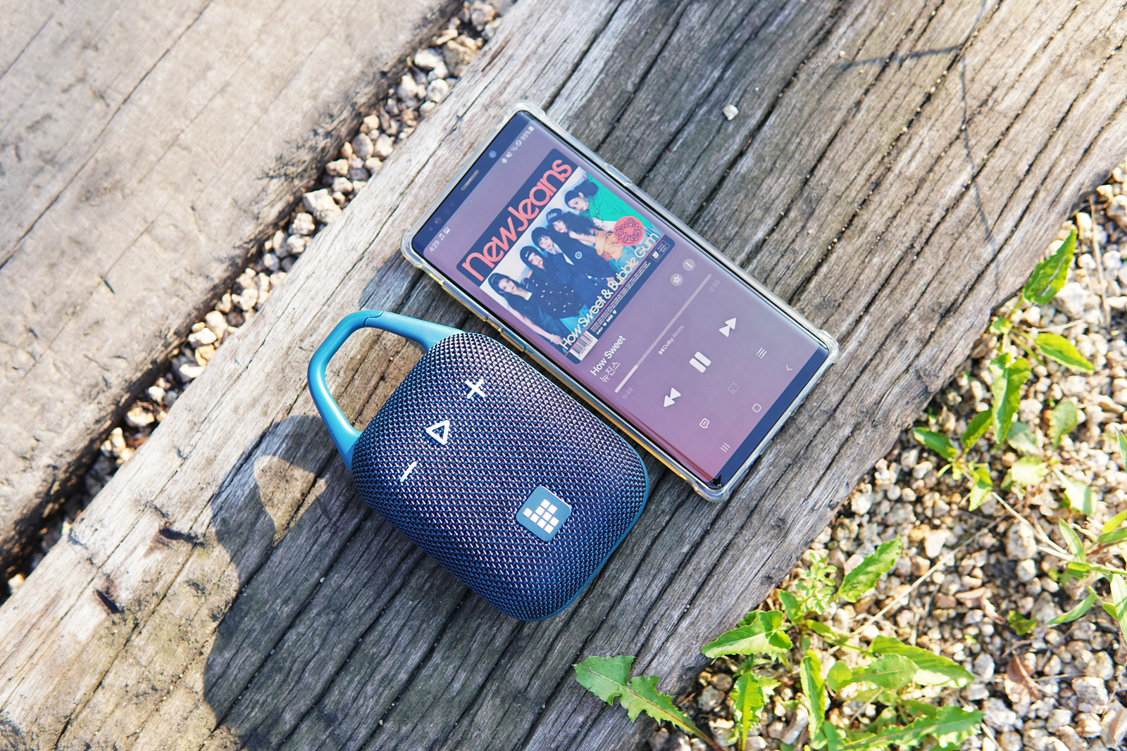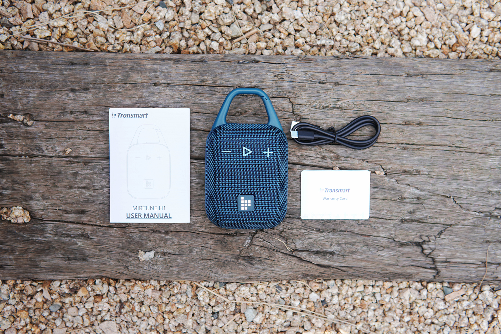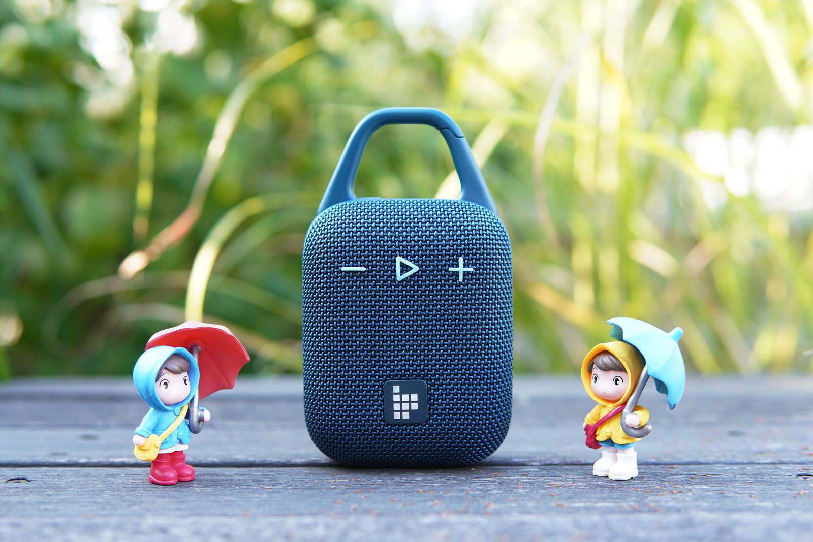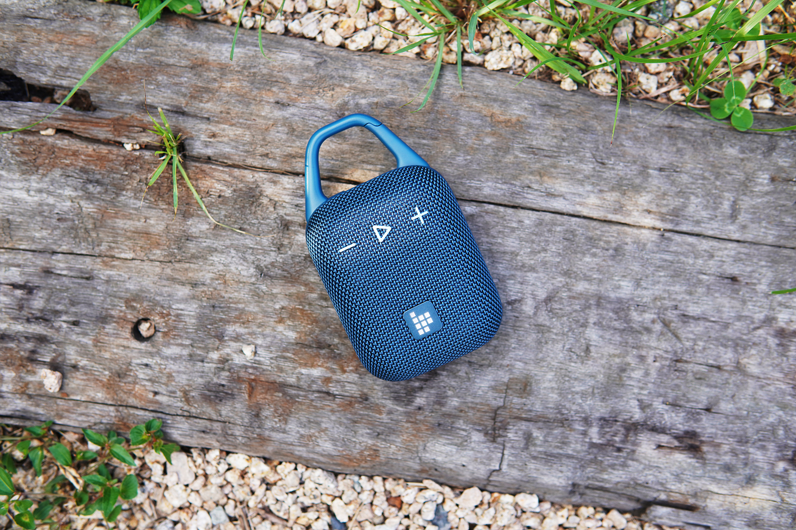 스피커의 외형은 누가 봐도 야외활동(아웃도어)에 최적화되어 있는 모습으로 위쪽에는 카라비너(클립)가 있어서 가방이나 필요한 곳에 편리하게 걸어둘 수 있으며 앞쪽 그릴에는 큼지막한 3개의 물리 버튼이 보입니다. 개인적으로는 터치보다는 물리버튼을 더 좋아하는 편이고 디자인을 해치지 않는 않을 만큼의 크기라서 마음에 들더군요. H1 스피커는 블랙, 블루 두 가지 색이 있는데 소개하는 블루는 파랑보다는 청록색에 조금 더 가까운 모습입니다.