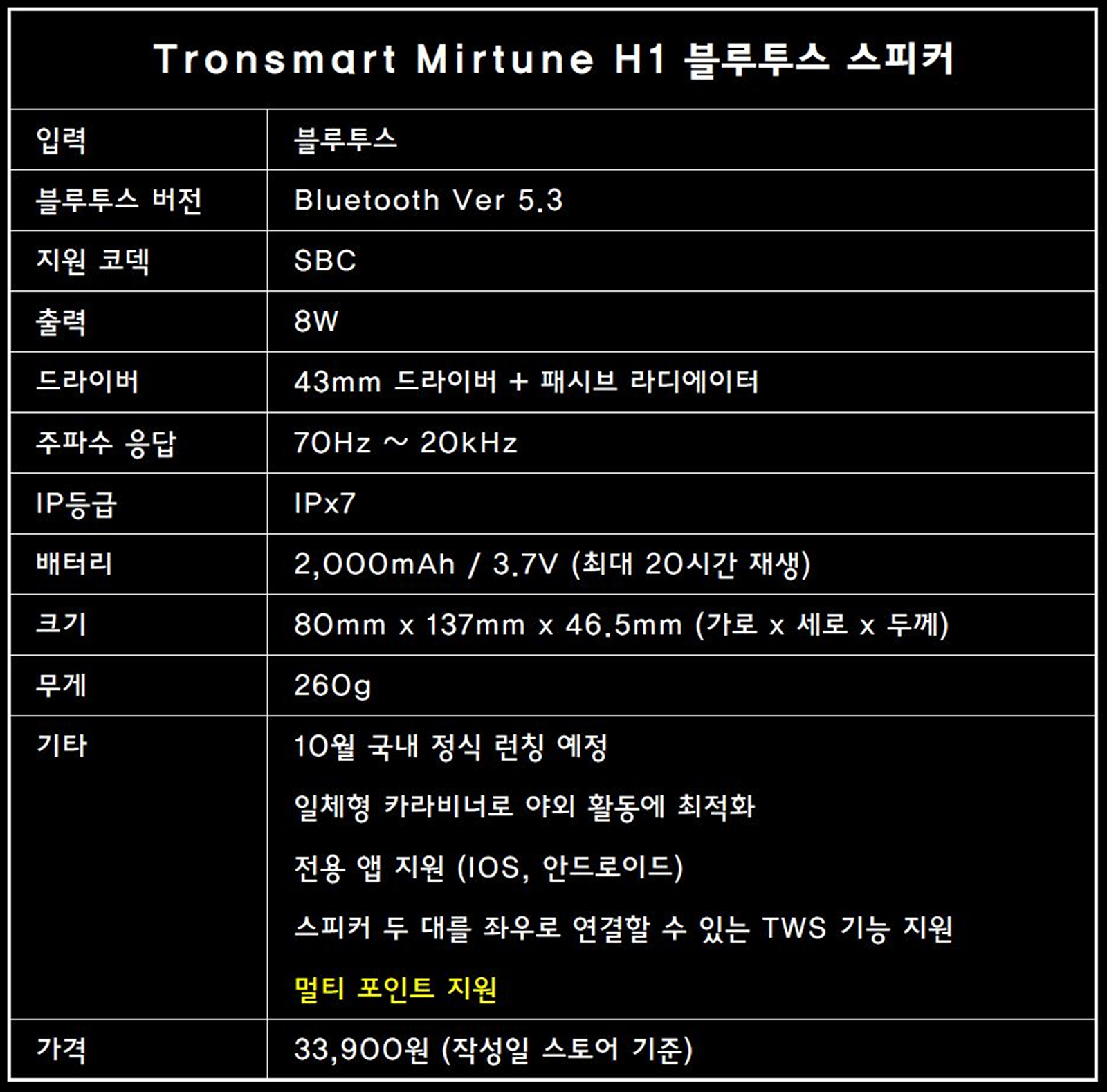현재 시장에는 비슷한 성격의 블루투스 스피커들이 제법 많은 편인데 H1의 가장 큰 장점이라고 한다면 스펙, 기능대비 놀라운 가성비라고 생각합니다. 해외 직구의 경우 as가 안된다는 단점이 있었지만 트론스마트가 정식으로 론칭이 된다면 이런 가격 경쟁력은 더더욱 올라갈 거라 생각합니다.