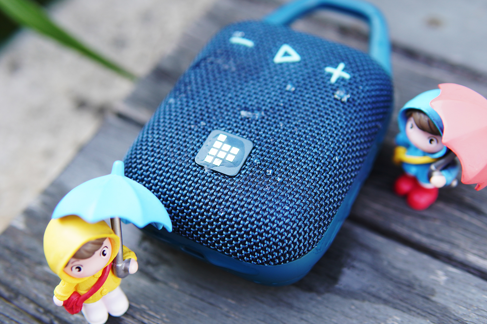 스피커 앞쪽은 패브릭으로 포인트를 주었으며 측면과 바닥은 TPU 재질로 마감을 했습니다. 실내보다는 야외활동에 더 중점을 둔 제품인 만큼 스크레치에 취약할 수밖에 없으니 좋은 선택이라 생각합니다. 스피커의 전체적인 디자인은 무난한 스타일이지만 JBL GO + 클립을 섞어놓은 듯한 느낌이었습니다.