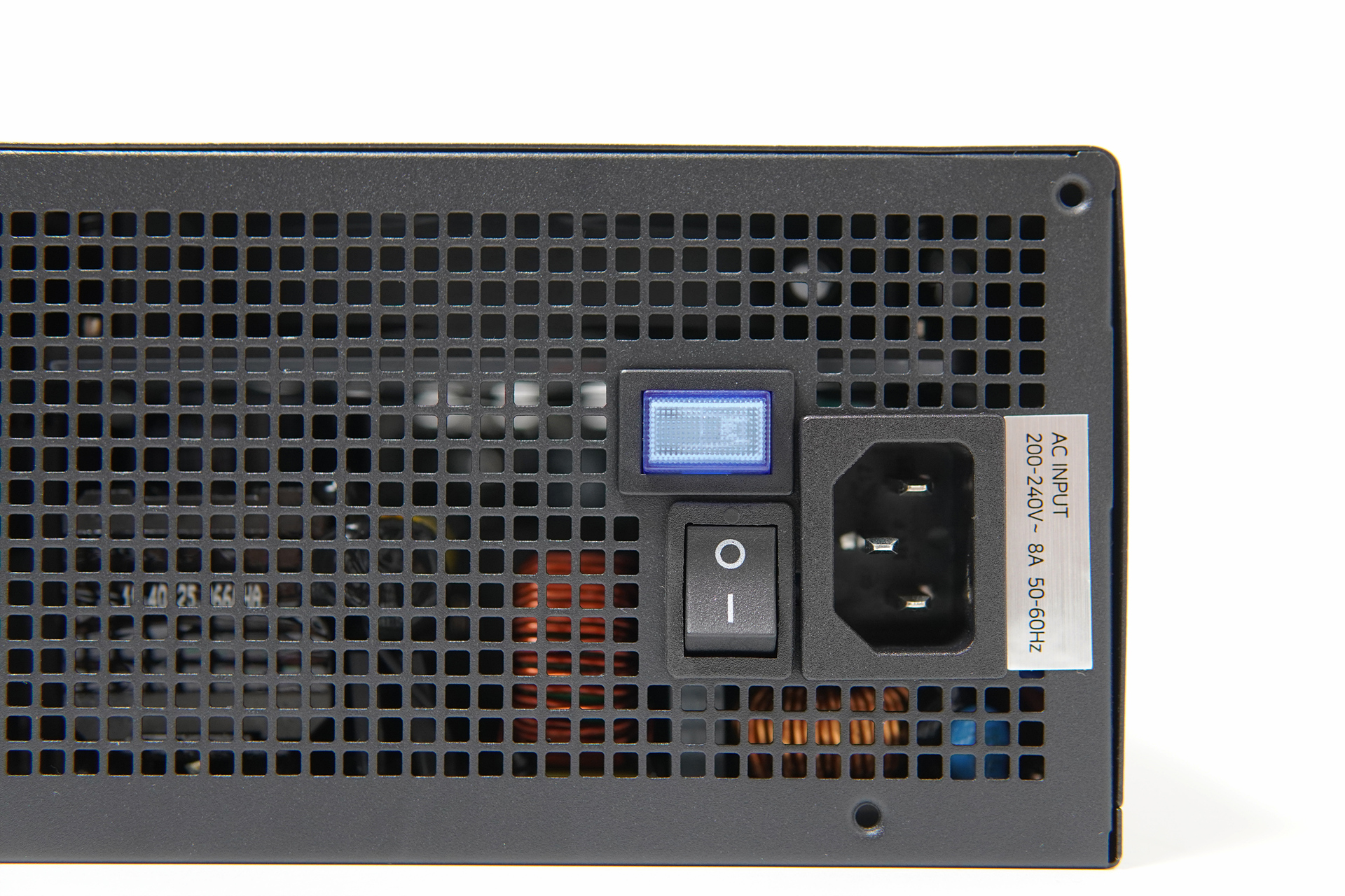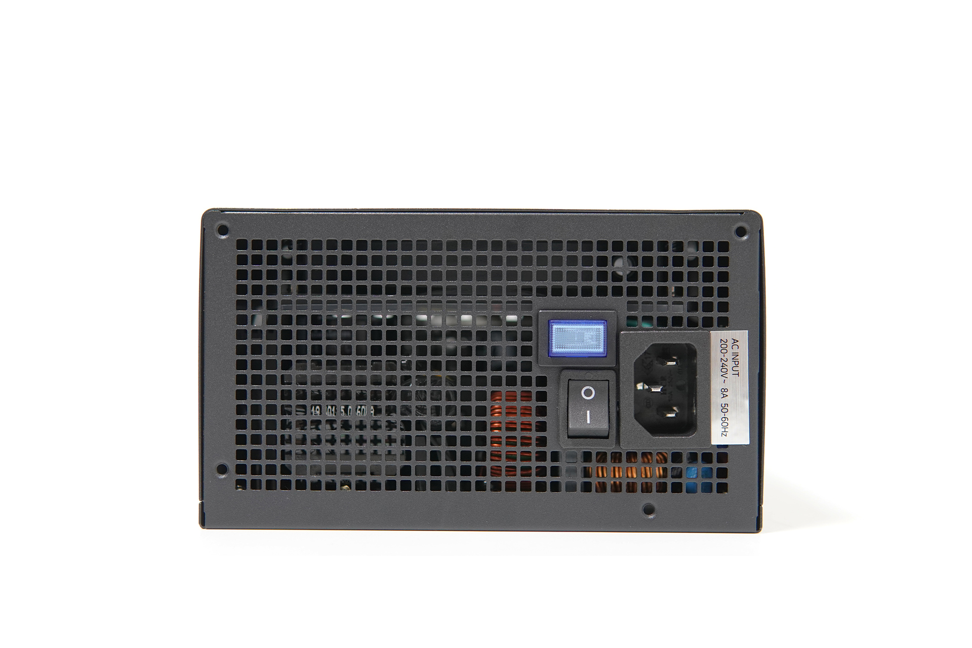 파워 내부에는 120mm FDB 방식의 쿨러가 사용되었으며 파워 뒤쪽의 파란색 스위치를 통해 제로 팬(Zero FAN) 모드를 선택할 수 있습니다. 제로 팬 기능은 내부 온도가 50℃ 이하에서 팬이 정지되어 저소음을 원하는 사용자들에게는 보다 조용한 환경을 만들어 줄 수 있습니다.