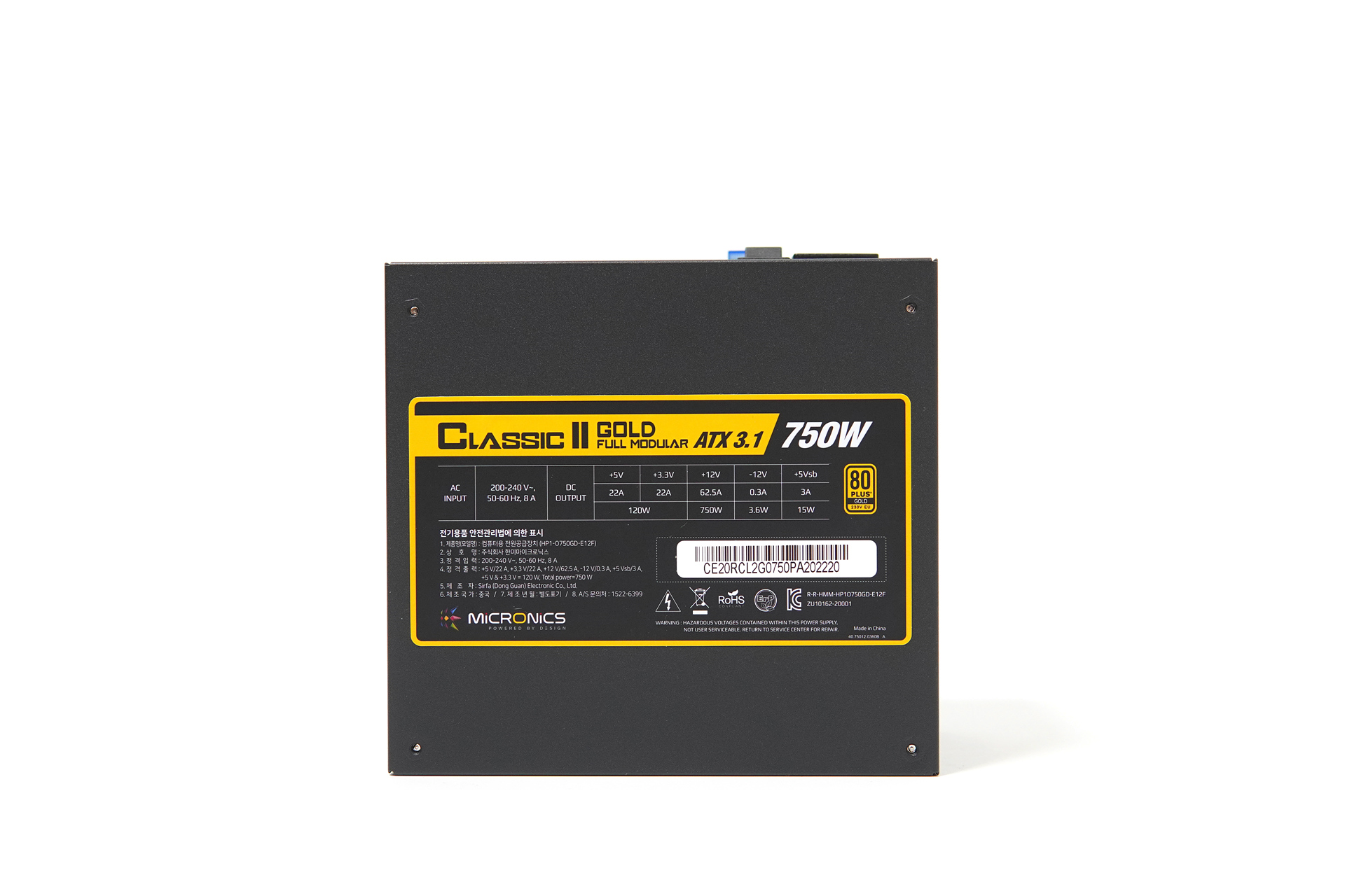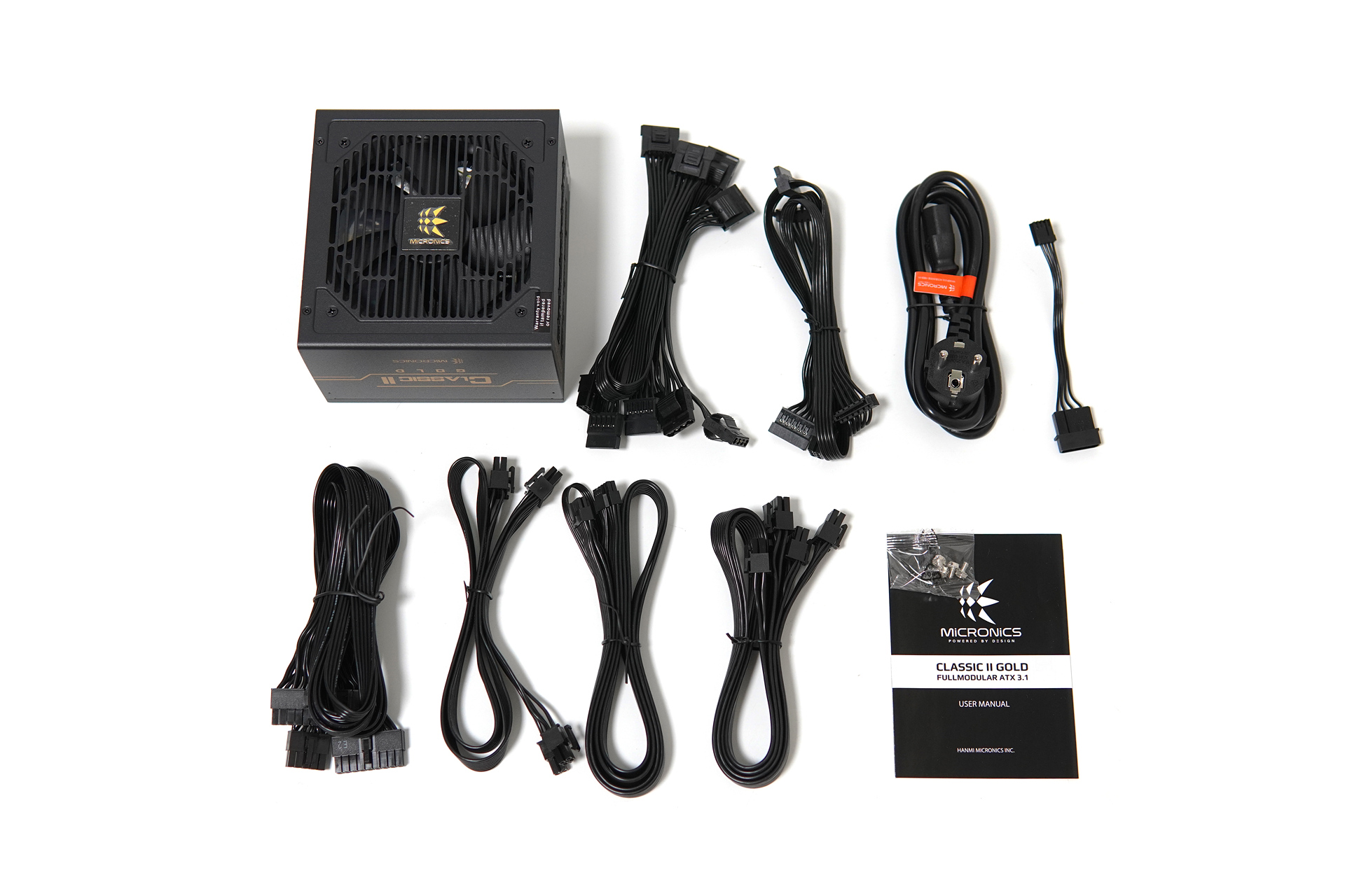 현재 판매가 되고 있는 마이크로닉스의 Classic 2 파워 서플라이는 용량에 관계없이 모두 풀 모듈러 방식으로 되어 있으며 80Plus Gold 인증을 받았습니다. (모든 케이블은 플랫 방식으로 되어있습니다.)
