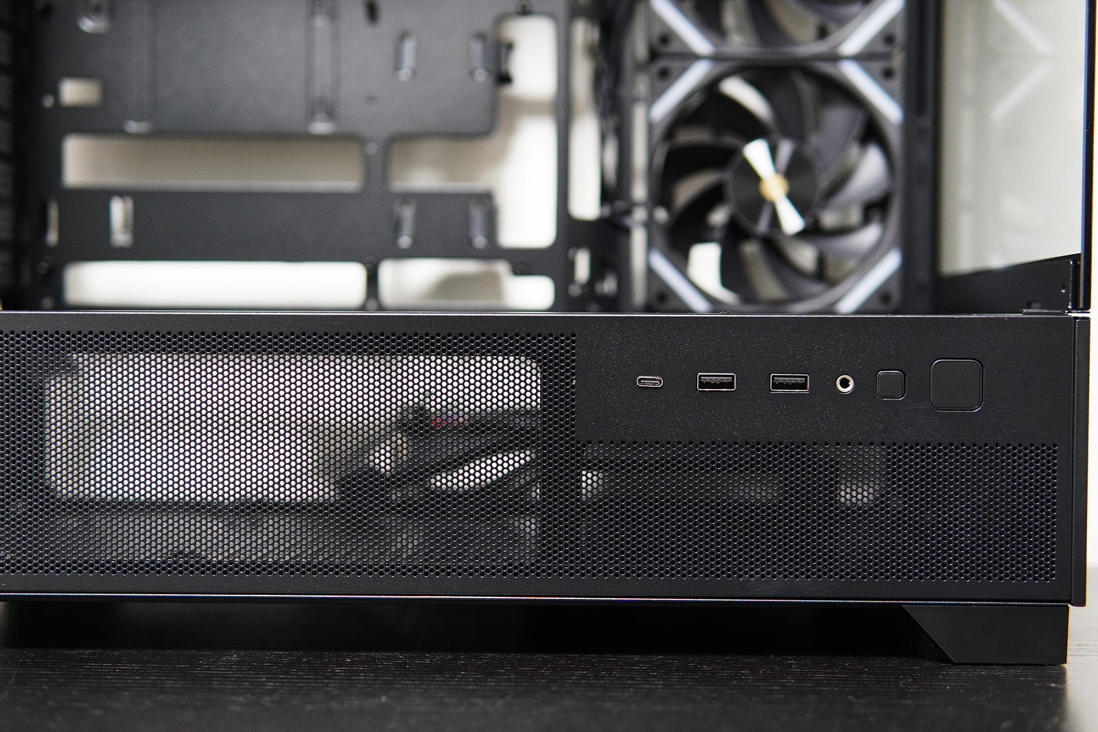 전원, RGB, USB 포트는 케이스의 위쪽이 아닌 측면에 자리 잡고 있는데 책상 위에 케이스를 놓고 사용하는 분들에게는 딱 맞는 위치라고 할 수 있지만 바닥에 놓고 사용하는 분들이라면 다소 불편할 수 있겠죠. 이 부분은 사용하는 환경에 따라 호볼호가 나뉠 거라 생각합니다.