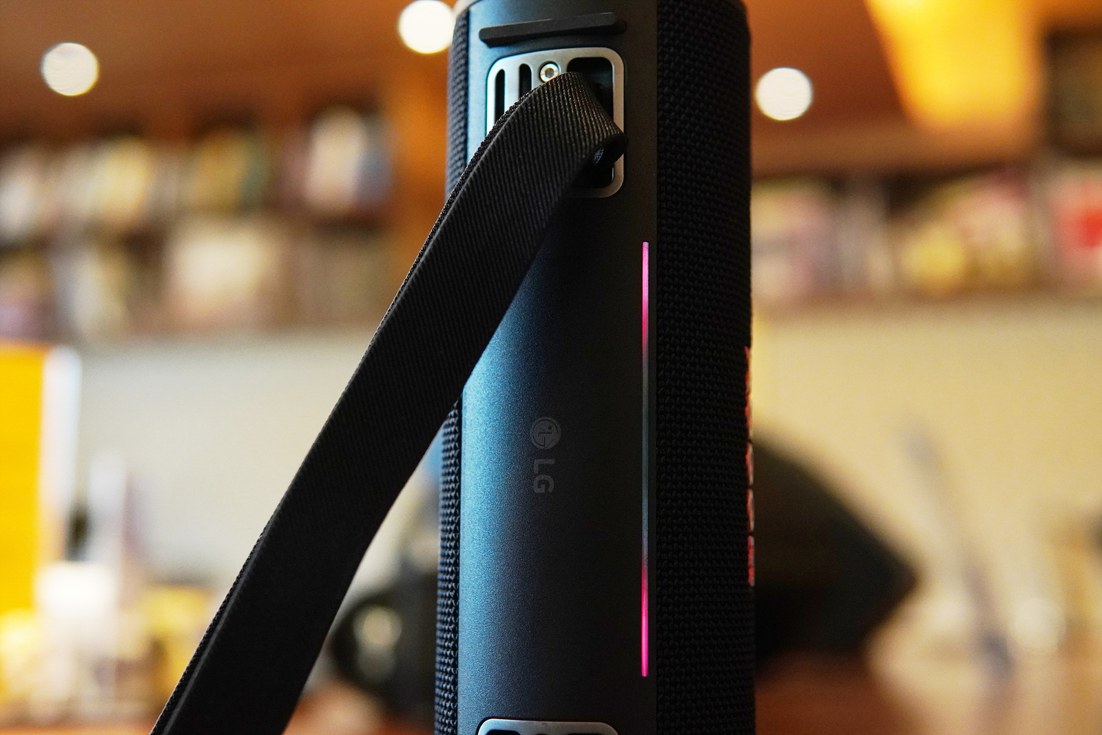 xboom 스피커의 기능적인 부분에서 가장 마음에 들었던 건 탄성이 있는 밴드였습니다. LG전자에서는 매직 스트랩으로 부르는데 단순 디자인뿐 아니라 스피커의 활용도를 더욱 높일 수 있어서 정말 칭찬해주고 싶은 부분이었습니다.