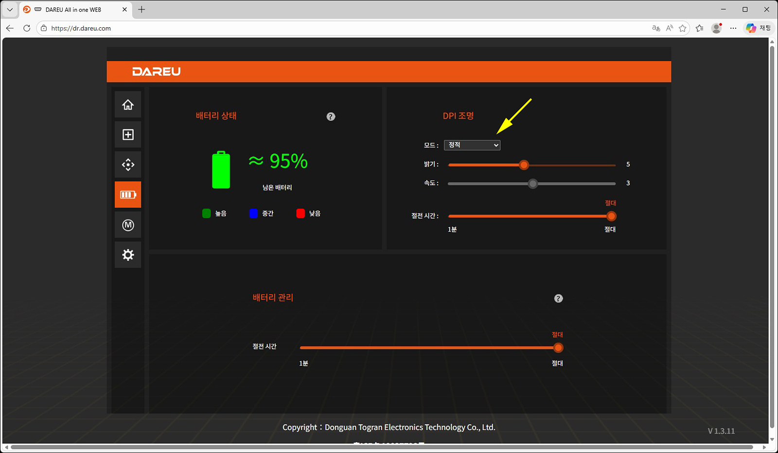 DPI 변환에 따른 LED를 바꾸고 싶다면 모드에서 지정을 해야 합니다. (기본 설정은 Off로 되어있습니다.) 마우스가 절전 모드로 들어가면 충전독의 디스플레이도 자동으로 바뀝니다.