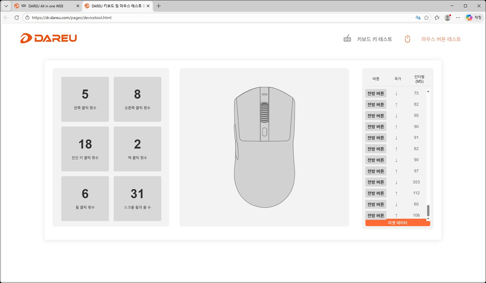 장비 테스트 도구에서는 마우스가 입력을 실시간으로 볼 수 있어서 마우스의 불량을 확인할 수 있습니다. 마우스의 버튼과 휠(스크롤, 클릭)까지 모두 확인할 수 있습니다.